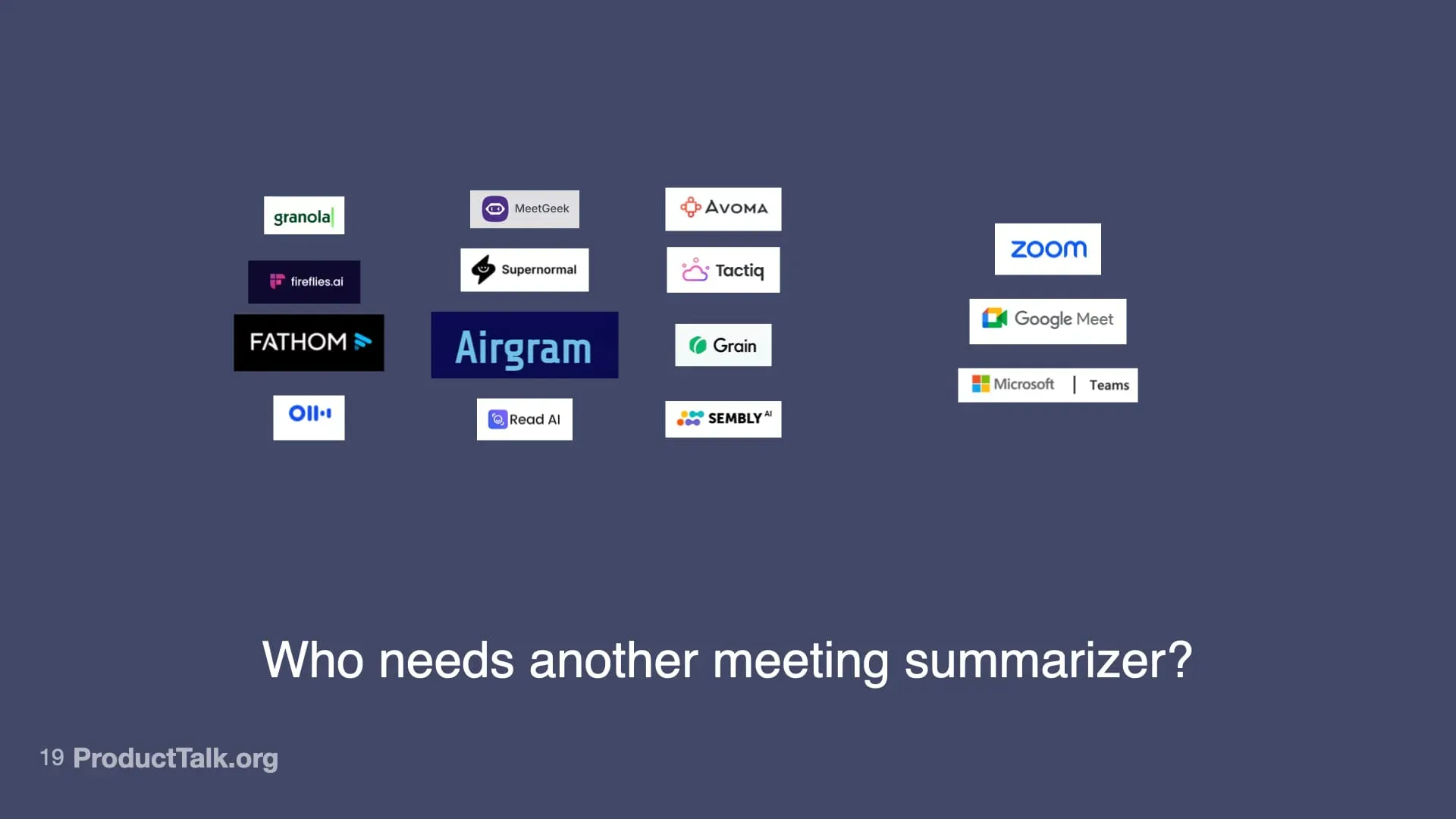 Why? Because you chose the wrong problem to solve. Who needs yet another meeting summarizer?