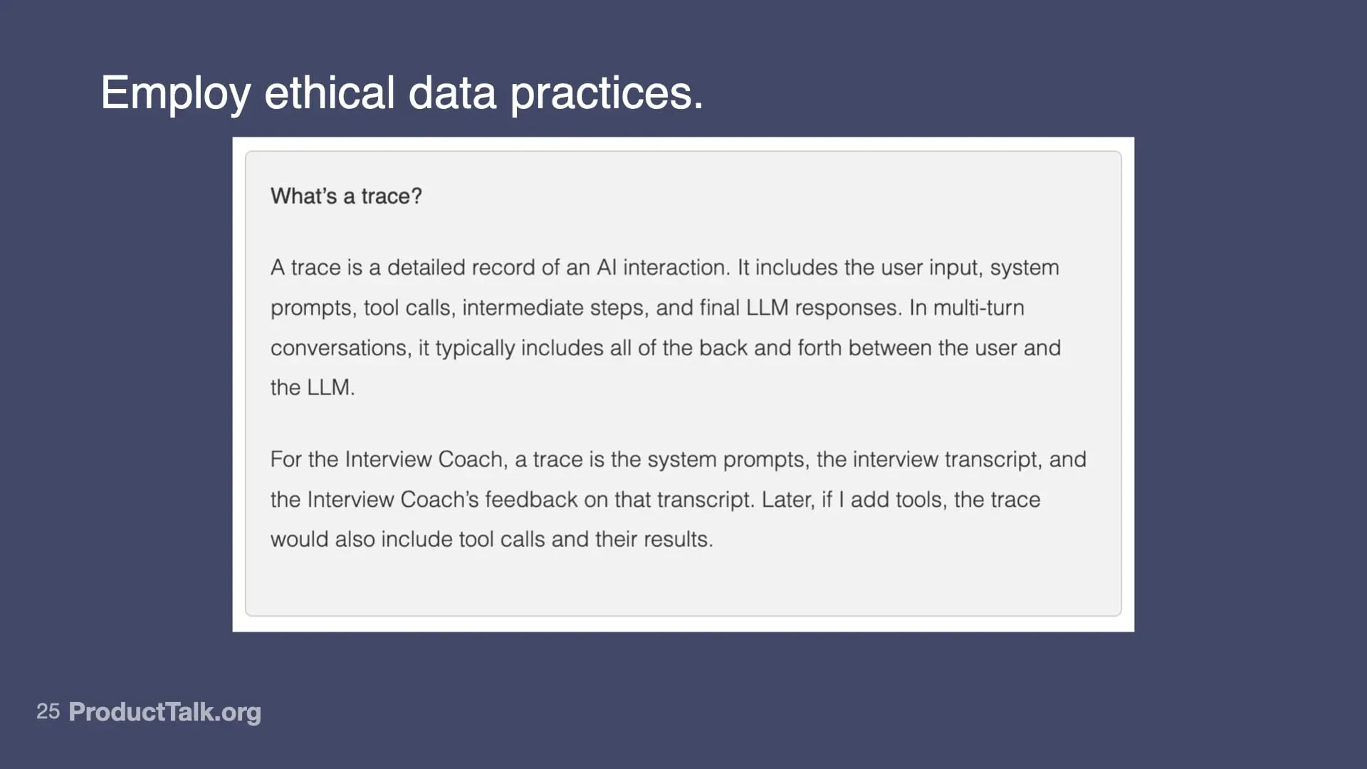 Here's where a lot of AI products get it wrong. They collect everything by default. They inspect traces without explicit permission. They optimize for their learning instead of user privacy.