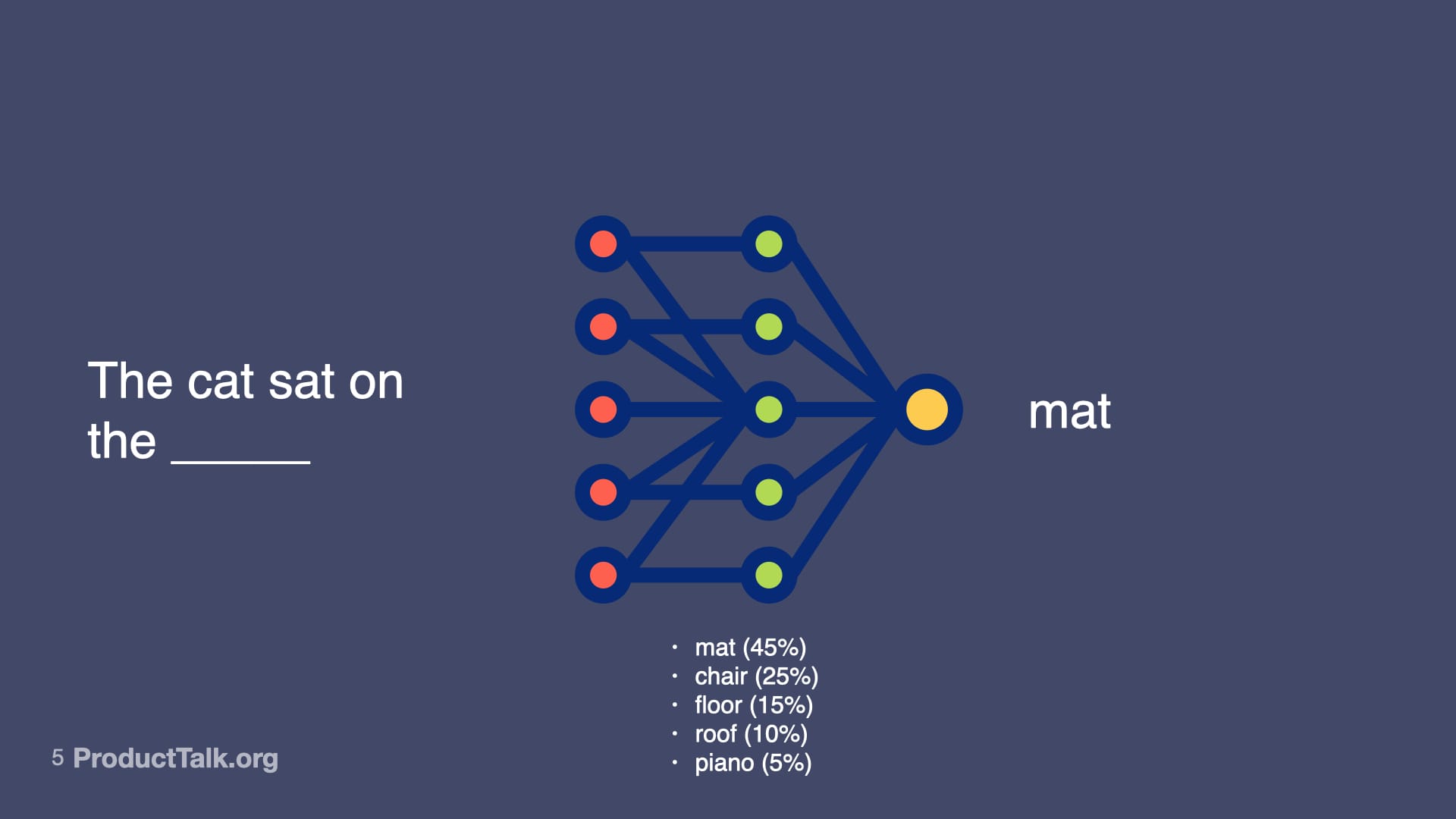 The model looks at all the text it's been trained on and calculates probabilities. Mat is most likely. Chair is pretty likely. Floor, roof, piano—all possible, just less probable.