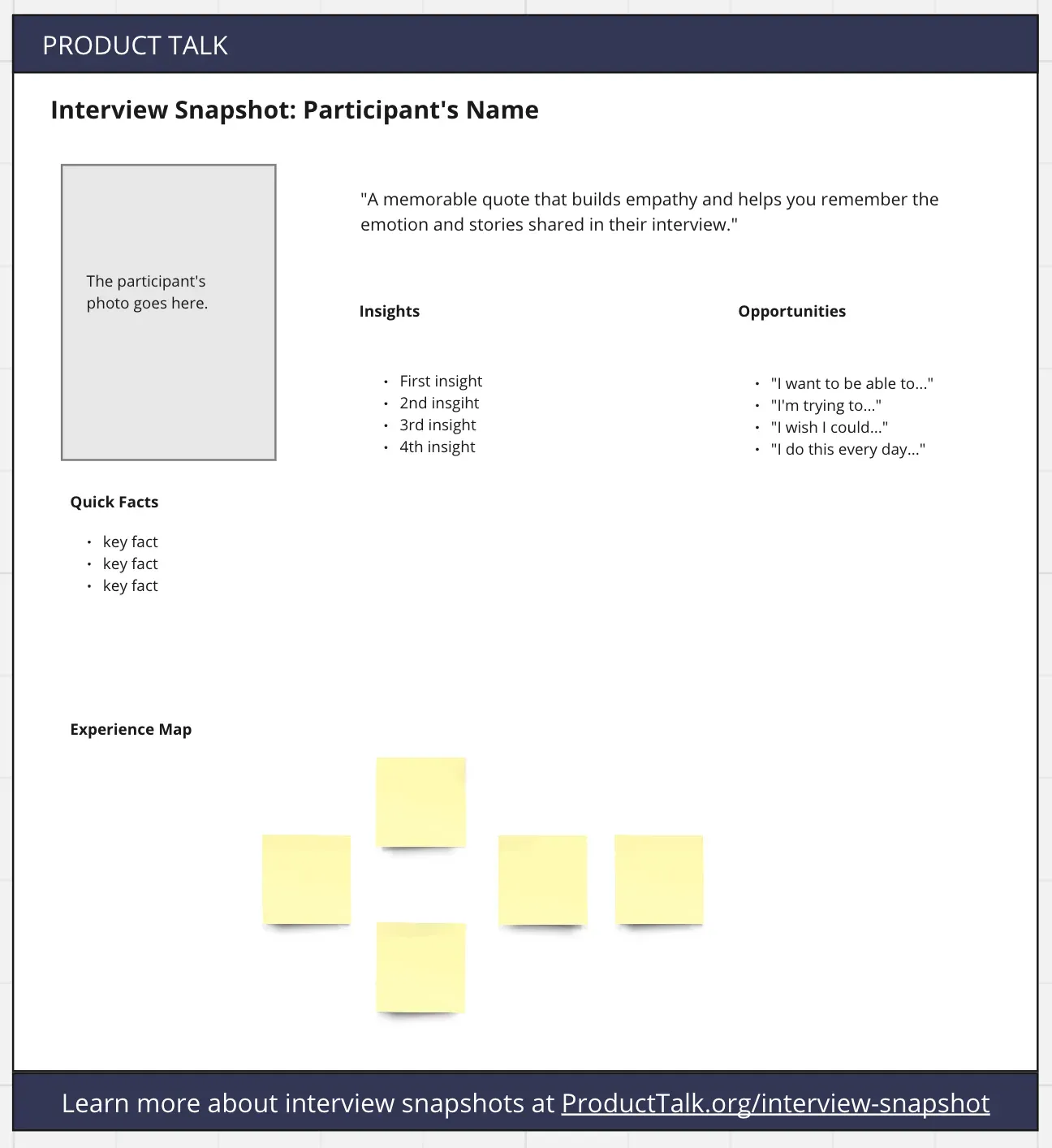 I like to use interview snapshots for single-interview synthesis. An interview snapshot helps to make our synthesis actionable. A snapshot includes several elements: quick facts that help us put the customer's story into context, a memorable quote that helps us remember the story, an experience map that represents the key moments in the story, and most importantly, a list of opportunities that we heard in the story.