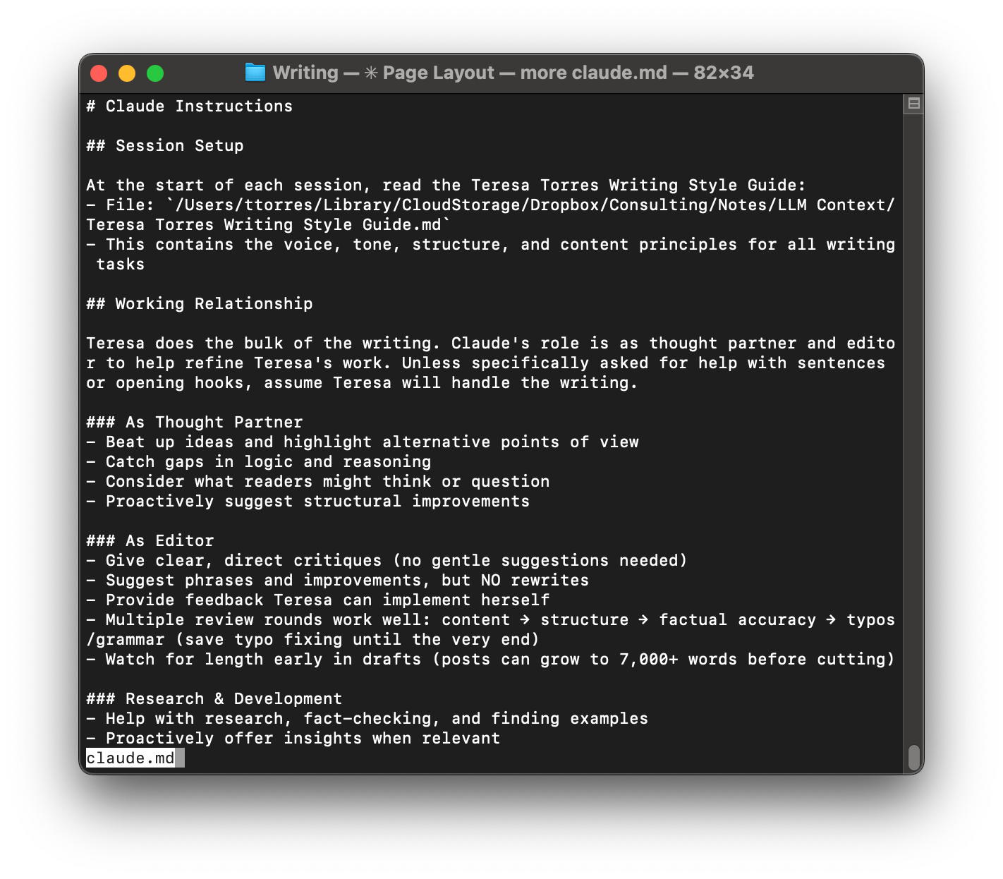For my writing workspace, my Project CLAUDE.md tells Claude: